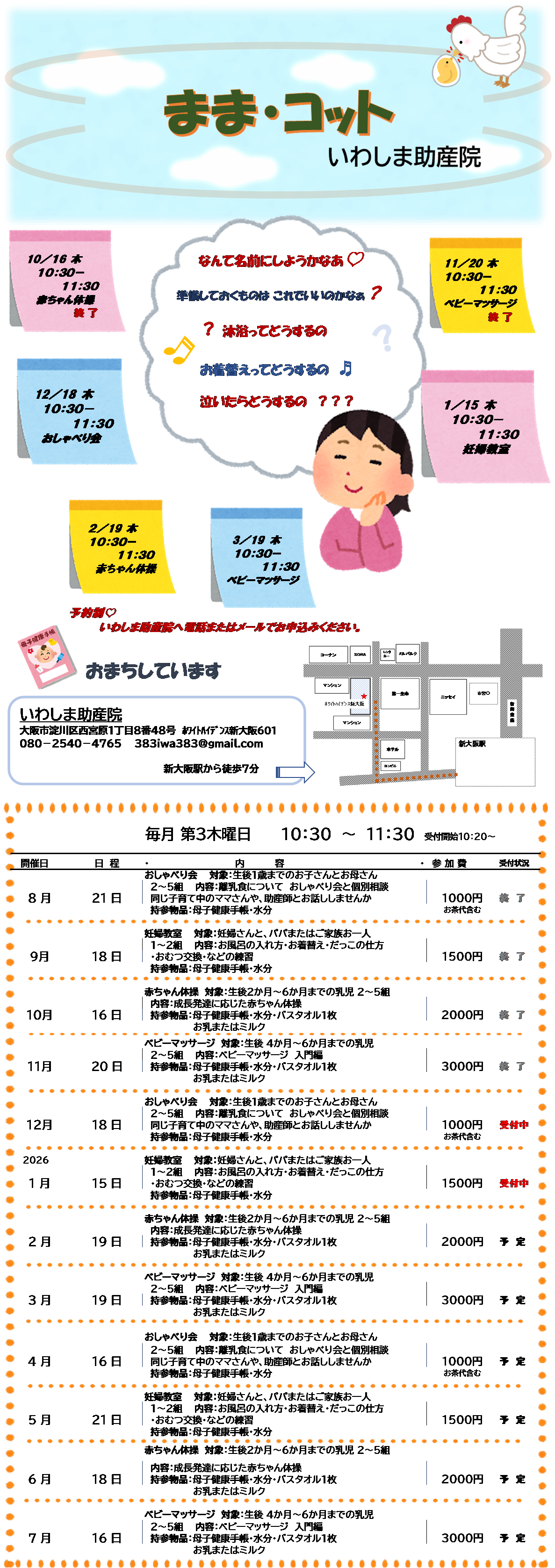 〝まま・コット〟 の開催 日時 2025年 12月20日 ㈭ 10 : 30~11 : 30 (受付 10:20~ ) 場所 いわしま助産院 内容 おしゃべり会 生後1歳までのお子さんとお母さん 離乳食などについておしゃべりや個別相談 費用 1,000円 お茶代を含む 参加者数 2~5組 母子健康手帳、水分 等 | ![]() ⇩ 今後の予定 |