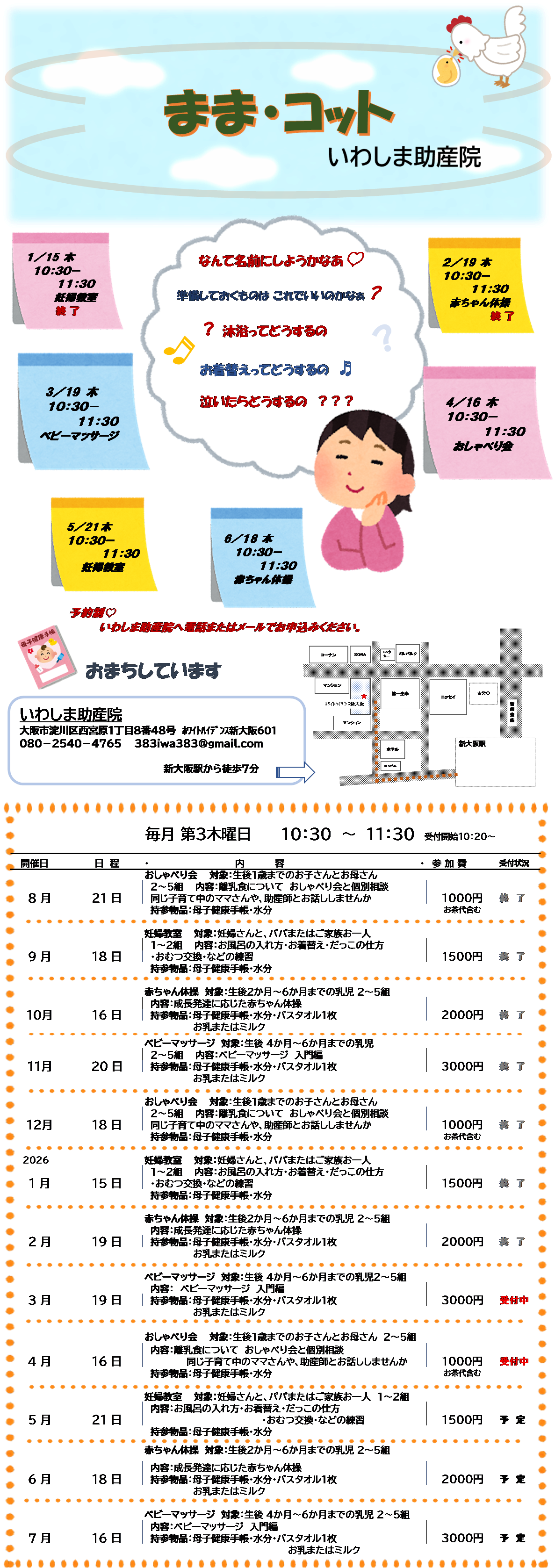 〝まま・コット〟 の開催 日時 2025年 3月19日 ㈭ 10 : 30~11 : 30 (受付 10:20~ ) 場所 いわしま助産院 内容 ベビーマッサージ 生後4か月~6か月までの乳児 ベビーマッサージ 入門編 費用 3,000円 参加者数 2~5組 母子健康手帳、水分、バスタオル1枚 等 | ![]() ⇩ 今後の予定 |